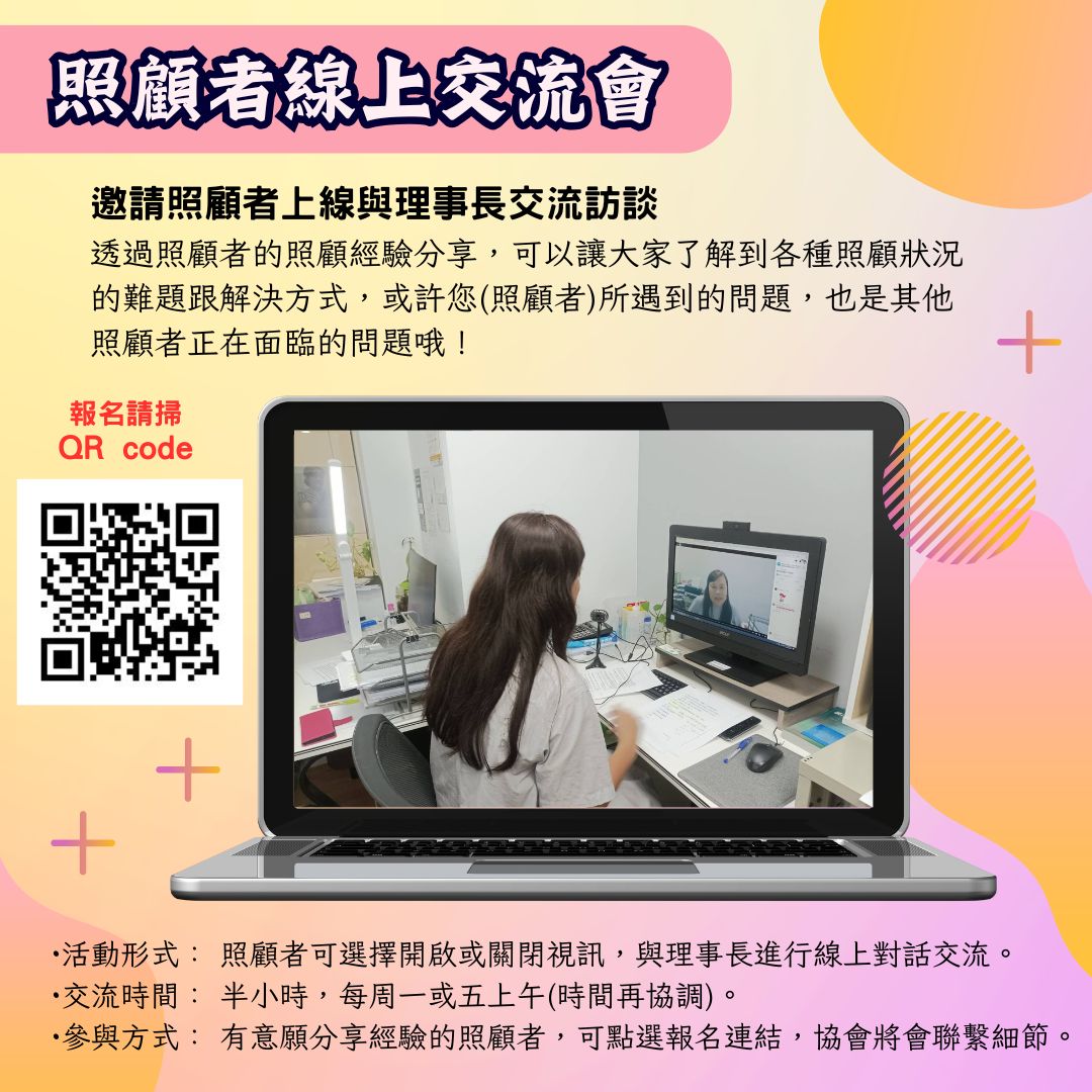 協會邀請照顧者上線與理事長交流訪談, 透過照顧者的照顧經驗分享,可以讓大家了解到各種照顧狀況的難題跟解決方式,或許您(照顧者)所遇到的問題,也是其他照顧者正在面臨的問題哦!